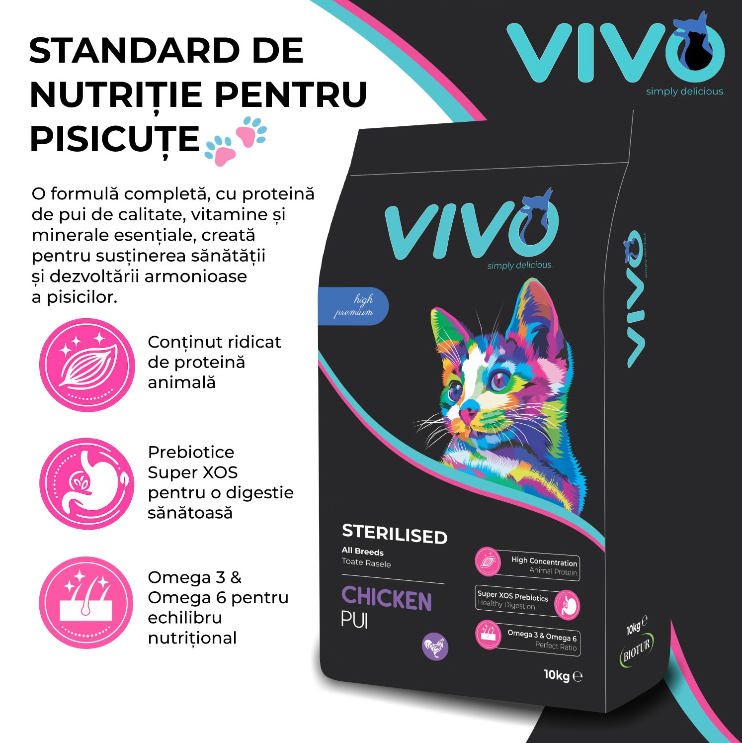 Ingrediente atent selecționate și un aport controlat de fibre ajută la promovarea unei digestii echilibrate, în timp ce combinația de vitamine și minerale susține funcțiile metabolice normale și vitalitatea generală. VIVO hrană cu carne de pui este potrivită pentru toate rasele de pisici sterilizate și oferă o nutriție completă pentru utilizare zilnică.