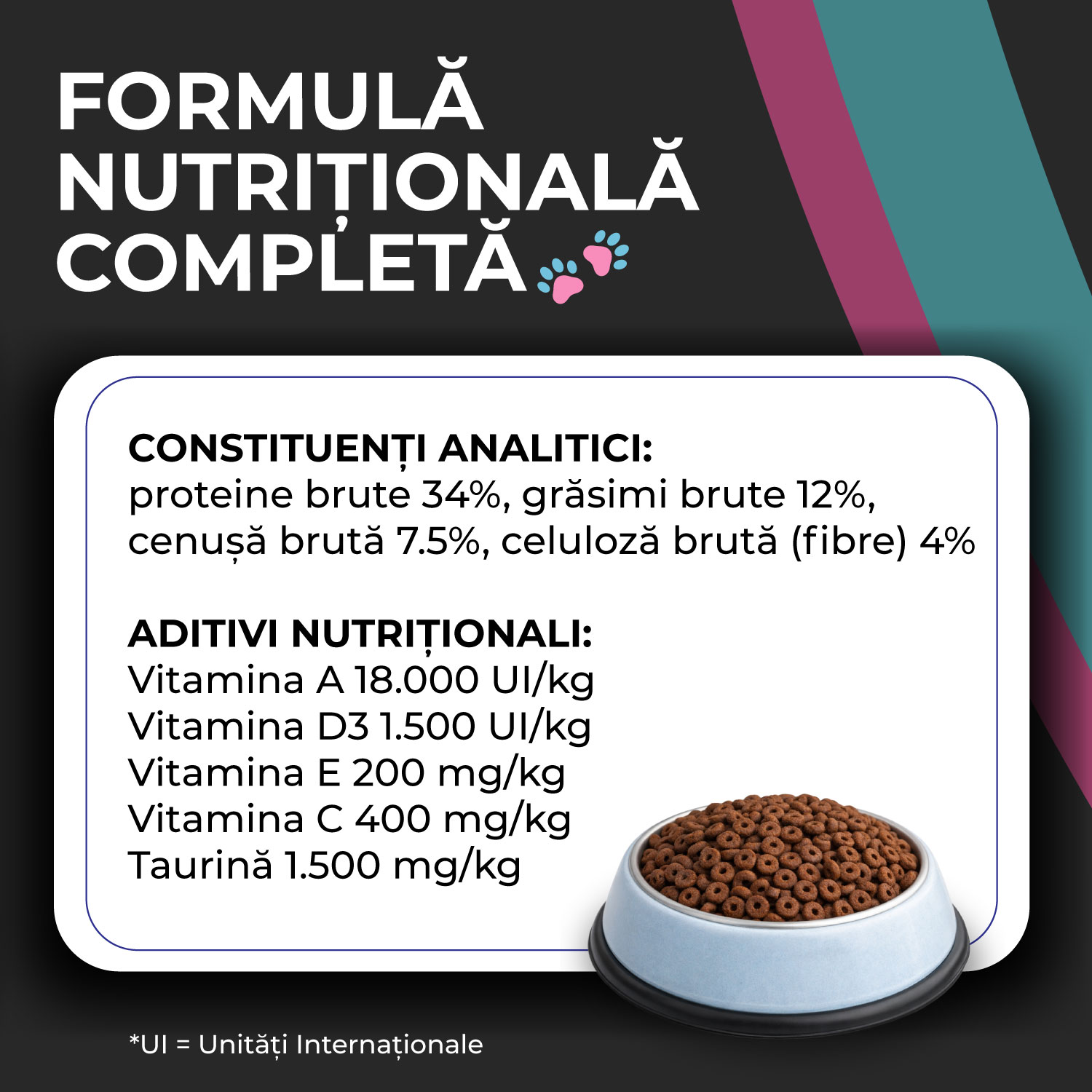 O formulă completă, cu proteină de pui de calitate, vitamine și minerale esențiale, creată pentru susținerea sănătății și dezvoltării armonioase a pisicilor.
