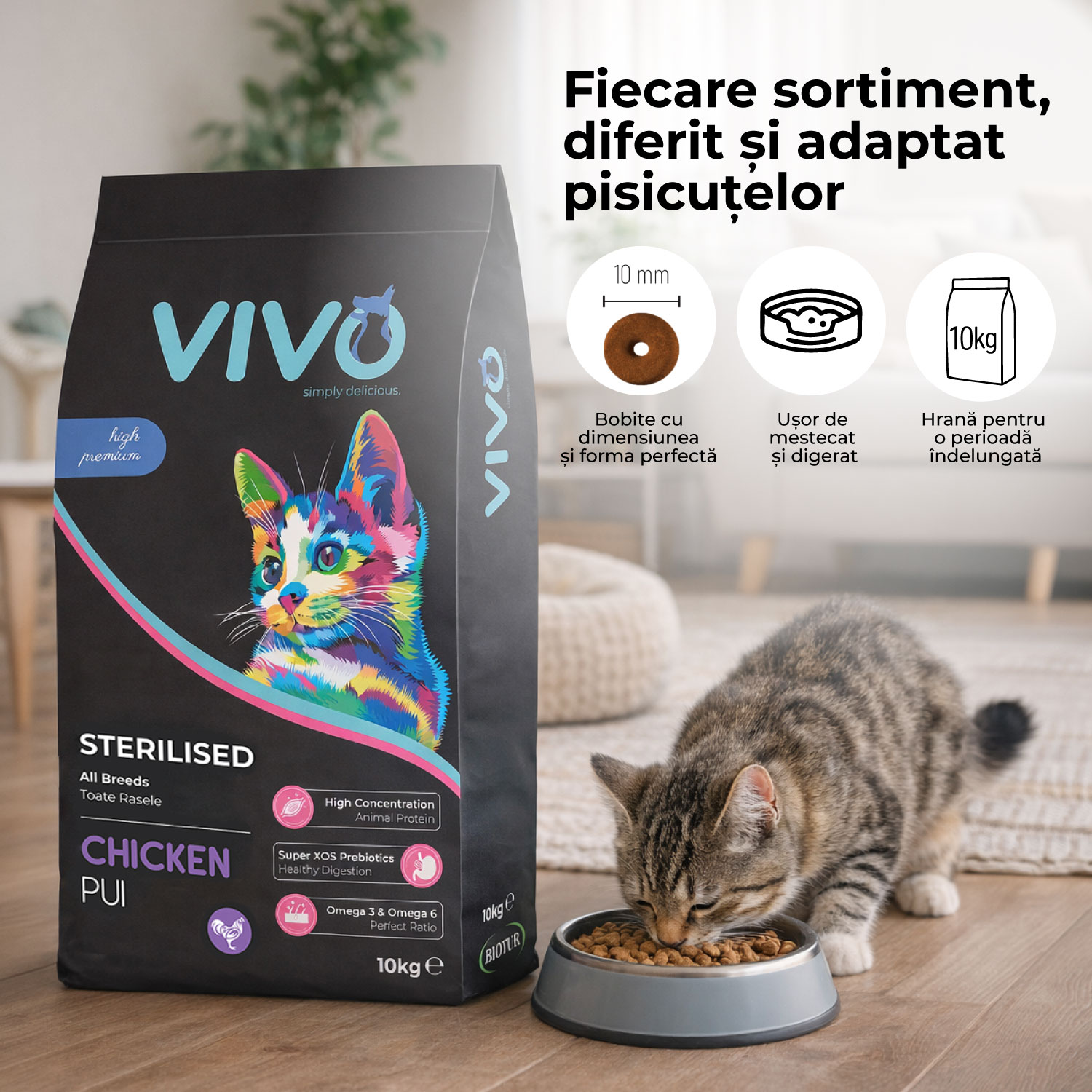 VIVO hrană cu carne de pui pentru pisici sterilizate este o formulă completă special creată pentru nevoile nutriționale ale pisicilor care au fost sterilizate. Această rețetă echilibrată utilizează proteine de înaltă calitate din carne de pui, combinate cu un profil optim de fibre și nutrienți pentru a susține un metabolism sănătos și condiția corporală ideală.