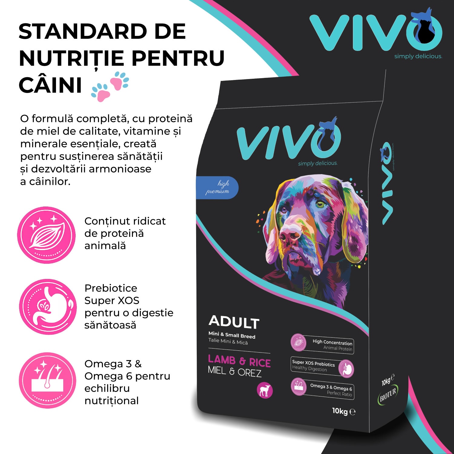 VIVO hrană cu miel și orez pentru câini adulți talie mică este o formulă completă și echilibrată, special creată pentru nevoile nutriționale ale câinilor maturi de talie mică. Rețeta pornește de la proteine de înaltă calitate provenite din miel, combinate cu orez ca sursă de carbohidrați ușor digerabili, oferind o nutriție adaptată metabolismului specific al câinilor de talie mică.
