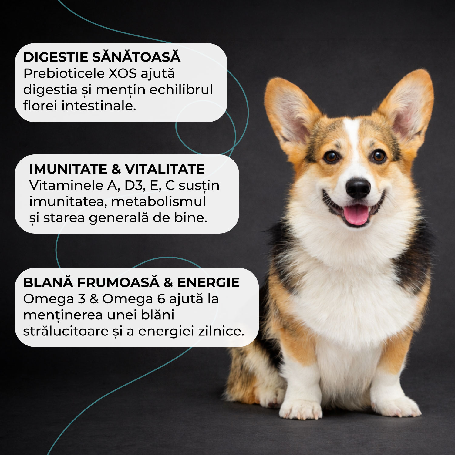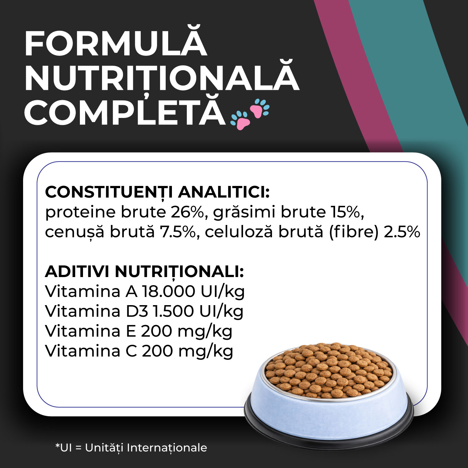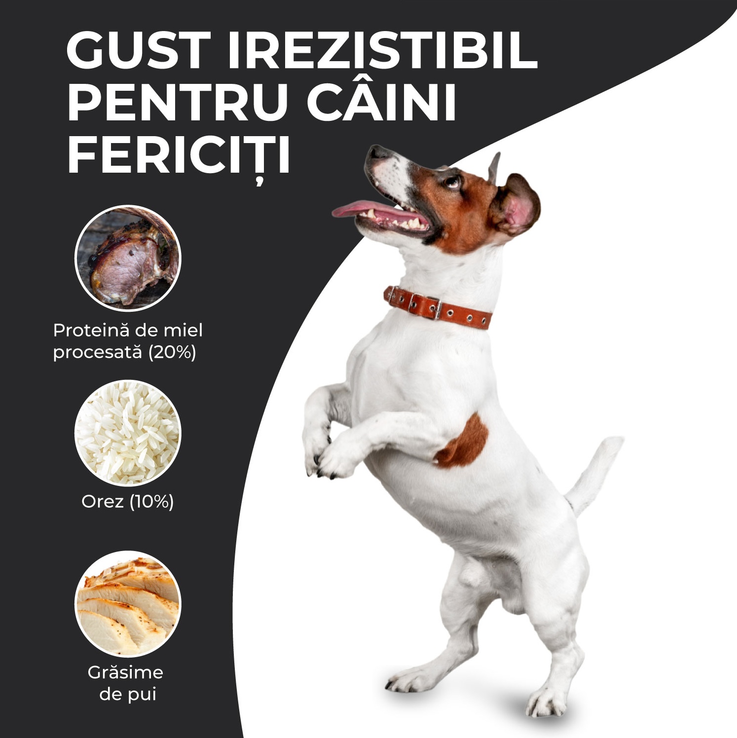 O formulă completă, cu proteină de miel de calitate, vitamine și minerale esențiale, creată pentru susținerea sănătății și dezvoltării armonioase a câinilor.