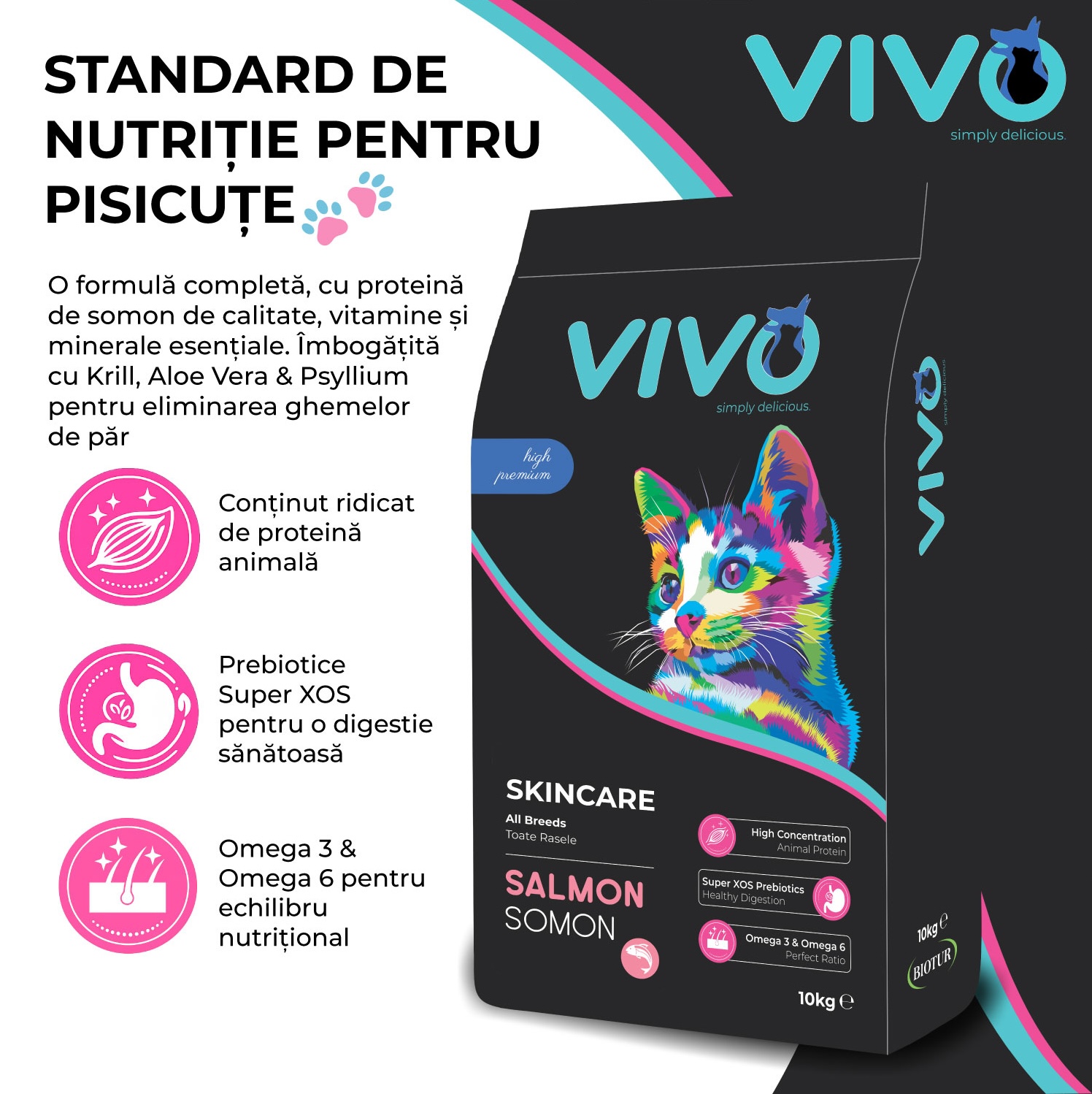 VIVO SkinCare cu Somon este o hrană uscată completă pentru pisici adulte, formulată pentru a susține sănătatea pielii și a blănii. Rețeta include proteine de înaltă digestibilitate din somon și un echilibru optim de acizi grași esențiali Omega-3 și Omega-6 pentru un nivel ridicat de palatabilitate și o textură acceptată chiar și de pisicile sensibile.
