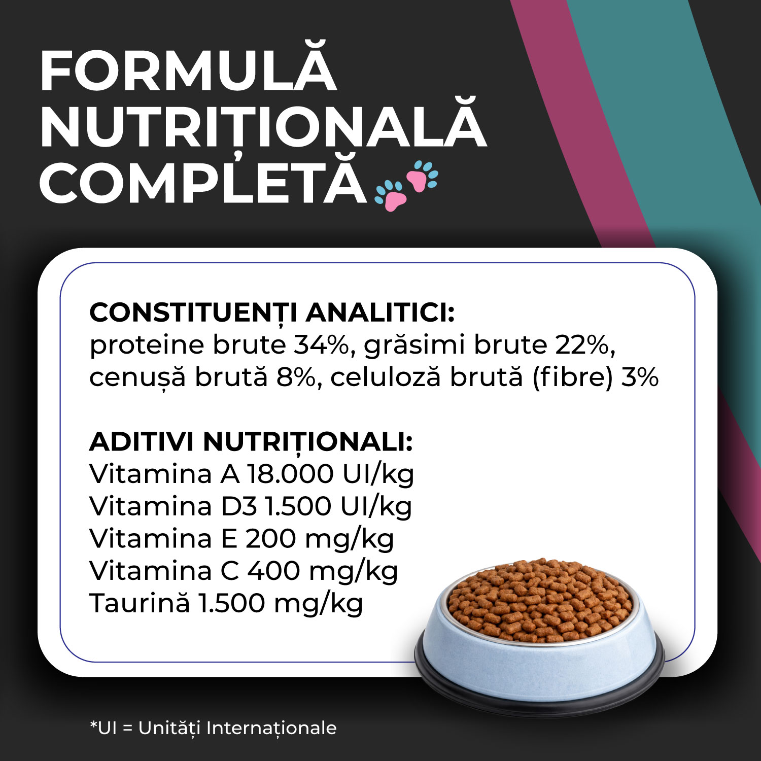 Ingrediente: Proteină de somon procesată (20%), proteină animală procesată, porumb, grăsime de pui, orez, proteină animală hidrolizată, aromă de pește, ulei de somon, ulei de hamsie, krill, vitamine și minerale, lignoceluloză procesată, sfeclă de zahăr, microalge, drojdie de bere, psyllium, xilo-oligozaharide, sare, Yucca Schidigera, DL-metionină, arginină, fenilalanină, tirozină, merișor, extract de gălbenele, aloe vera, taurină (3a370), conservanți – antioxidanți (E320 & E321).