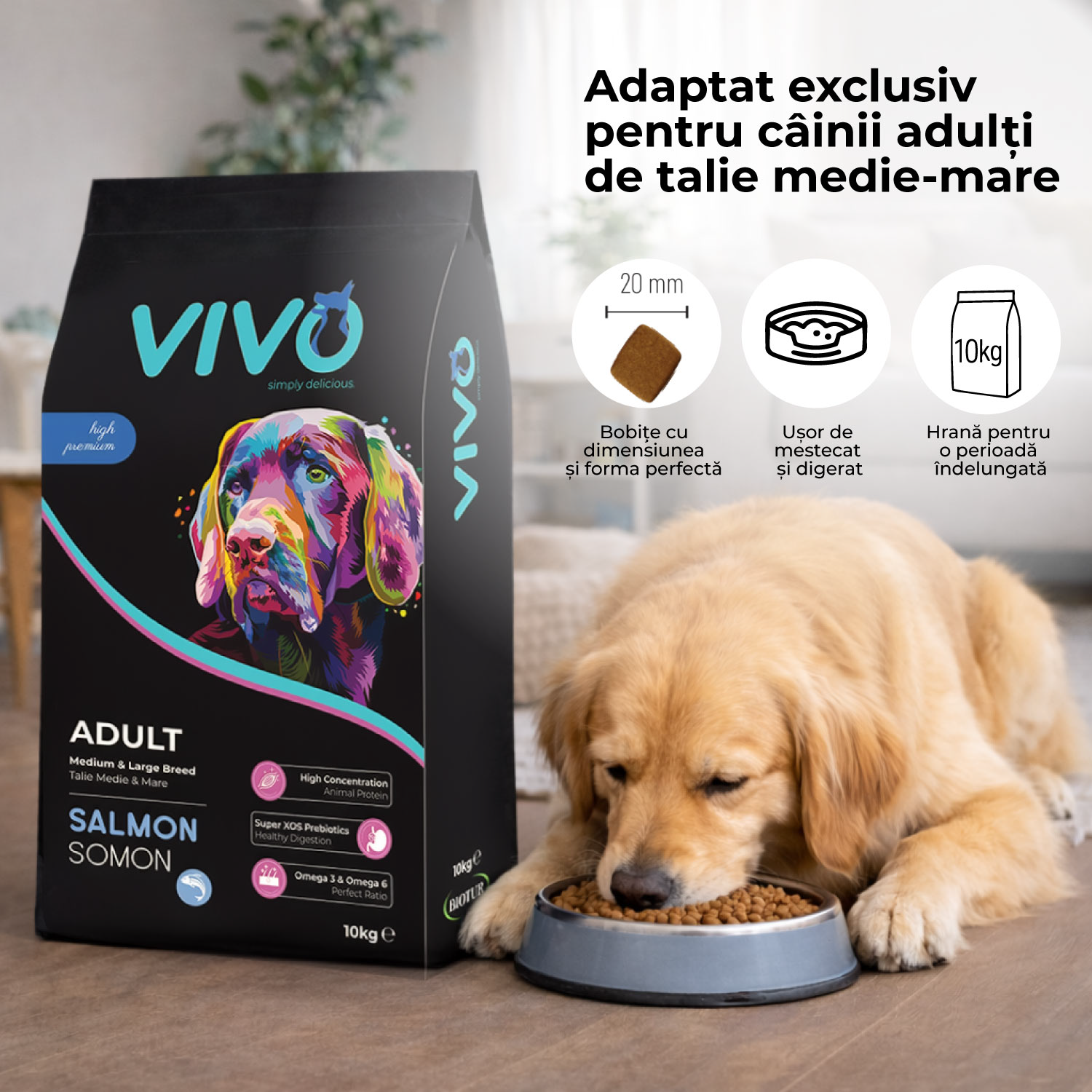 VIVO hrană cu somon pentru câini adulți talie medie și mare este potrivită pentru toate rasele de câini maturi din aceste categorii și poate fi utilizată zilnic ca parte a unei diete complete și echilibrate.